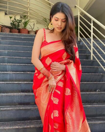 Red Color Soft Banarasi Silk Saree with Golden Zari Work