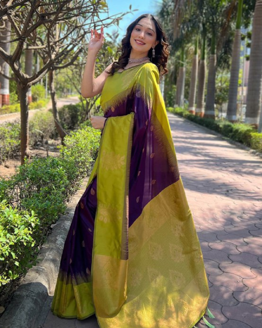 Parrot Green And Purple Color Recently Launched Soft Banarasi Silk Saree with Classy Bloue Piece
