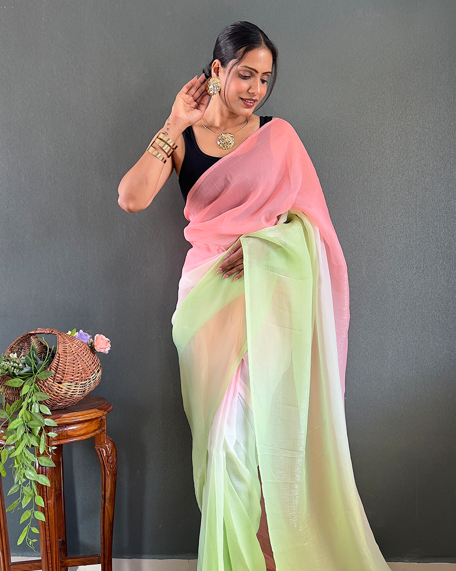 Pink And Green Color 1-Minute Ready To Wear Georgette Saree With Blouse Piece