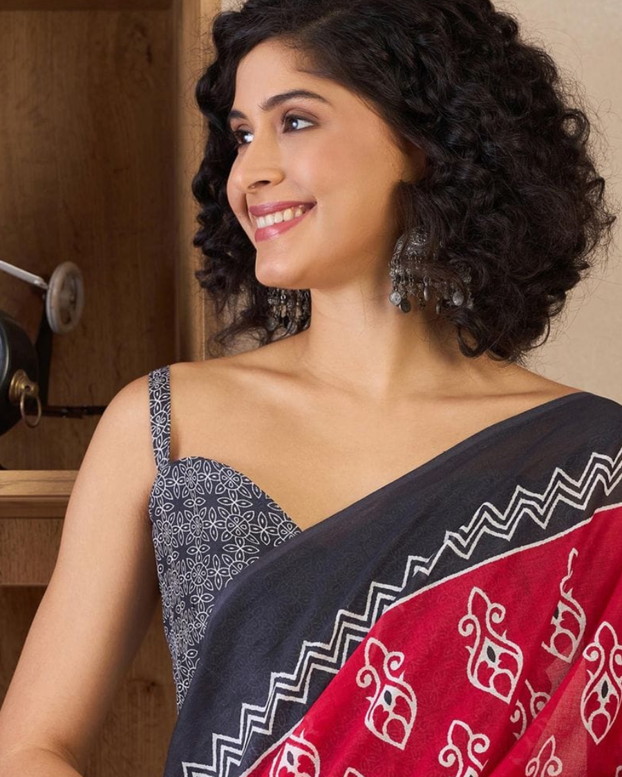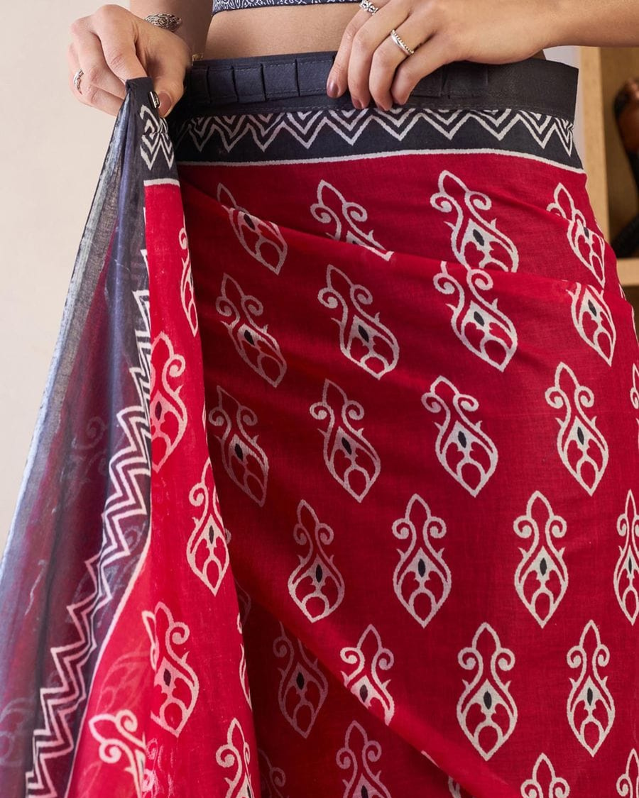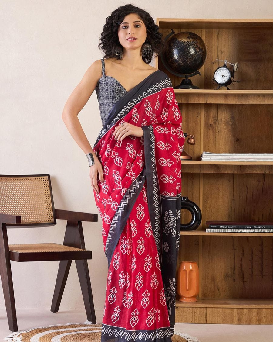 Red Color Mulmul Cotton 1 – Minute Ready to Wear Saree with Pocket and Blouse Piece